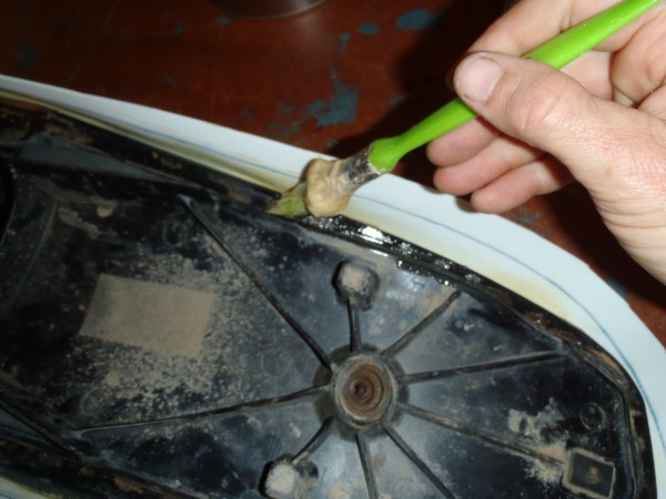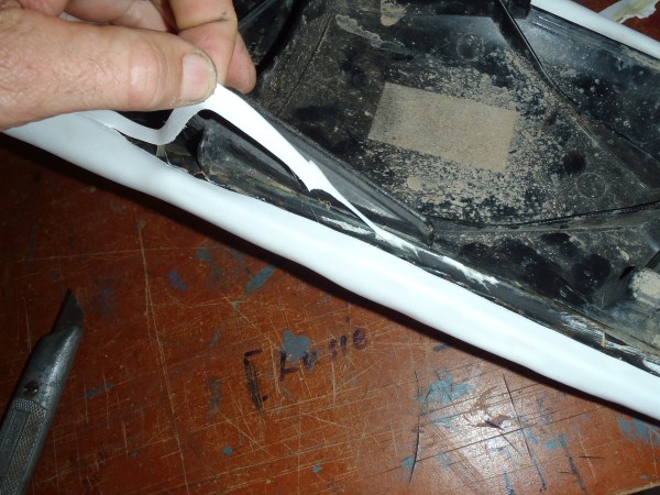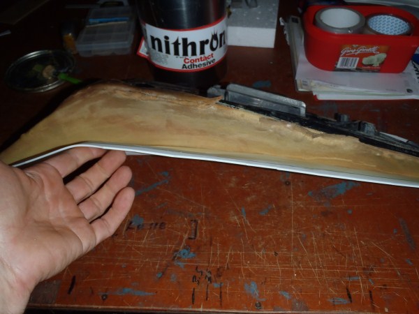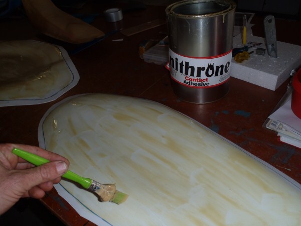 Apply some contact adhesive on the plastic base and on the overhanging EVA foamwrap. Wait till touchdry.